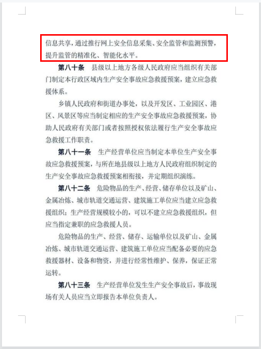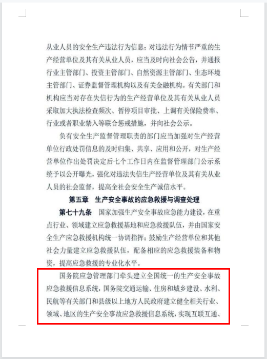 《中華人民共和國安全生產(chǎn)》(2021年修正)第五章第七十九條:國務(wù)院應(yīng)急管理部門牽頭建立全國統(tǒng)一的生產(chǎn)安全事故應(yīng)急救援信息系統(tǒng),國務(wù)院交通運輸、住房和城鄉(xiāng)建設(shè)、水利、民航等有關(guān)部門和縣級以上地方人民政府建立健全相關(guān)行業(yè)、領(lǐng)域、地區(qū)的生產(chǎn)安全事故應(yīng)急救援信息系統(tǒng),實現(xiàn)互聯(lián)互通、信息共享,通過推行網(wǎng)上安全信息采集、安全監(jiān)管和監(jiān)測預(yù)警提升監(jiān)管的精準(zhǔn)化、智能化水平。